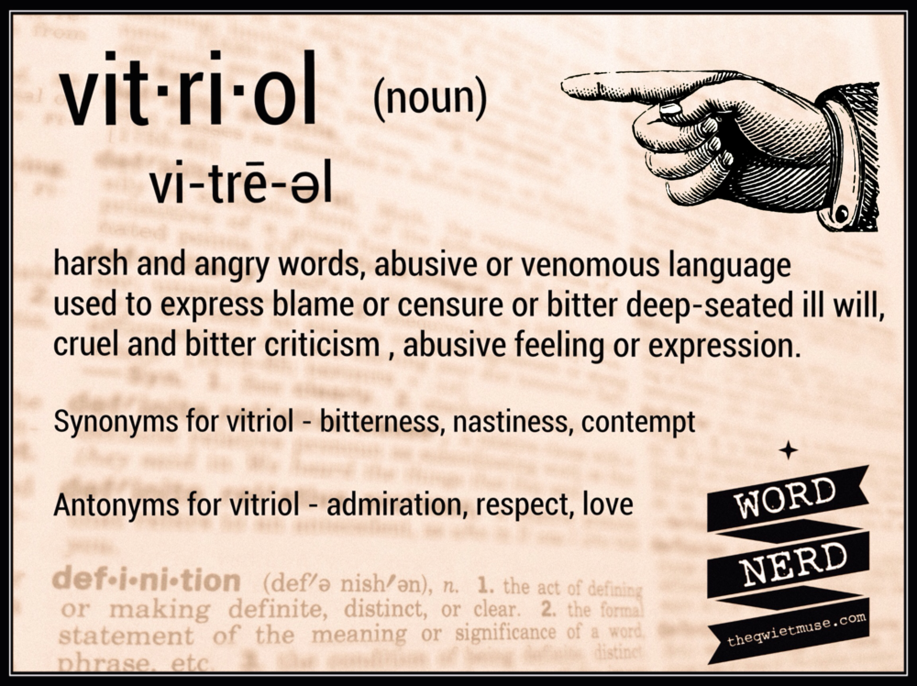 image Nov9 Published at 3000 × 2244 in Word Nerd – Word of the Day – Vitriol If you liked what you just read, like it, pin it, share it, tweet it, stumble it! Thank you!Tweet Click to share on StumbleUpon (Opens in new window) StumbleUpon Share on Tumblr Click to email a link to a friend (Opens in new window) Email PocketMore Click to share on Reddit (Opens in new window) Reddit Like Loading...